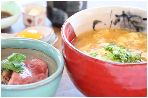 お料理に合う厳選された2種類の兵庫県産卵をお楽しみください。うどんには生姜を入れると体が温まり、お肉には「高砂の夕日」の卵黄をかけるとまろやかな味わいに。